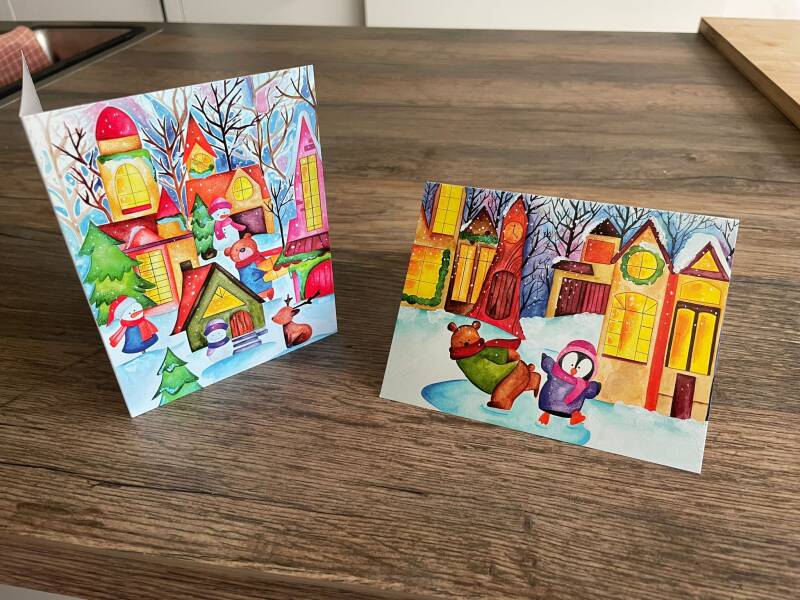 De kaarten worden verkocht in een set van 4 (2 x 2 designs), voor slechts 16 euro. En voor iedereen die 2 sets koopt, krijg je een gratis kerstpostkaart met een speels ontwerp erbij! 🎁